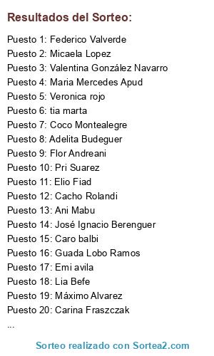 Lista de participantes: Lu Lascano(3 participaciones), Floppy reca(10 participaciones), Flor Catania(3 participaciones), Jimena Álvarez(2 participaciones), Lucy Acardi, Érika Luna, Magui Álvarez, luz peña(2 participaciones), aguitos morales(2 participaciones), viole soto, vito cordero(2 participaciones), henny martin, cami mozzoni(2 participaciones), gabi steimberg(2 participaciones), andru arroyo(2 participaciones), lean auvieux, pancho bruhl, gabi abbas(2 participaciones), conti zavaleta, Magui Navarro Vittar(2 participaciones), Jose Villeco(2 participaciones), Cande Romero, Sofi Soler, Sol argañaraz(2 participaciones), Cande romero, Lula veron(2 participaciones), Magda paz posse, Vale sturgeon(7 participaciones), Sofi acuña, Sole quintana, Maru lopez figueroa, Cocho Poviña(5 participaciones), Agus Lobo Ramos(3 participaciones), Jony Durán(2 participaciones), Guada Lobo Ramos(3 participaciones), Sofi Lobo Ramos(2 participaciones), Inés Cardenas(48 participaciones), José Mendilaharzu, Erika hansen(2 participaciones), Adrian Barón(2 participaciones), Viky Garcia, Roberto Puig, Gaston Caracci, Sabrina Sánchez, Pri Suarez(2 participaciones), Ceci Lopez, Eli andole, Carla Caracci, Carmela Caracci, Cami Albornoz, Regina Acosta, Constanza Manay, Ana Clara Torres, Luciana López Jim(2 participaciones), Carolina Fuensalida(5 participaciones), Manuel Nougues(10 participaciones), Thomas Nougues, Chloe Nougues(2 participaciones), Ada Martinini(2 participaciones), Maria Eugenia Romano(2 participaciones), Luz Córdoba(4 participaciones), Cesar Córdoba, Vero Tortonese(5 participaciones), Nacho Romano, Evaristo Poviña, Carina Fraszczak(5 participaciones), Juan Romano, Lucas Ojea(2 participaciones), Valentina Gelleni(5 participaciones), Ailen Ojea(3 participaciones), Sofi Fares(2 participaciones), Daniel Ojea(4 participaciones), Aldu(2 participaciones), Toma Novillo(2 participaciones), Patricia Perez(2 participaciones), Emmanuel Valoy, Carla Millán, Lorenzo Franco(5 participaciones), Pau Salomón(5 participaciones), Alejandro Rocchio, Gabriela Rolandi, Luquitas Cordoba(2 participaciones), Nancy Perez, Paula Vocos, Maria de la Paz Vies, Lourdes Colombres, Osvaldo Alvarez(2 participaciones), Maria Virginia Cossio, Sole Alvarez(10 participaciones), Máximo Alvarez, Carlitos Alvarez, Noelia Roda(2 participaciones), Carlota Albornoz, Maria Del Carmen Pacios(5 participaciones), Mer martinez(2 participaciones), Emi Ascarate(3 participaciones), Lou vides(2 participaciones), Maru kestelman(2 participaciones), Sabri pascual(10 participaciones), Marijo grignola, Gorda colombres(2 participaciones), Romina manrique, Paulina Alfieri(2 participaciones), Josefina Cotella(2 participaciones), Delfina Padilla, Haydee Mercedes Cheverria, Santiago Forns(2 participaciones), Justina Borras(2 participaciones), pauli pedraza, Nico Giampaoletti, Anita Soraires, Vero Lopez Orce(5 participaciones), Sonia Cardenas(2 participaciones), Maria Mercedes Apud(5 participaciones), guadalape aguiar, guadalupe benassar(3 participaciones), florencia benassar, valentina cazullo, sofia alvarez, lourdes dantur, lucia bleckwedell, victoria paz posse, guadalupe aguiar, carolina silvetti, milagro nicossia, rosario martinez muñoz, sofia servitje, lucia topa(5 participaciones), Matías López(6 participaciones), Florencia russomano, Vicky Ruíz(5 participaciones), Luciano Martin Ovejero(2 participaciones), Constanza Paz Posse(2 participaciones), María Graciela Valberdi, Adrián Bonifacio, Martina pochat, Miguel Ramos, Clau Brito(3 participaciones), Flor Pereyra, Flor pereyra(2 participaciones), Carolina Chehin, Adela Quinzano(10 participaciones), Cristian Herrero, Pichi Morales, Agus Bujazha(2 participaciones), Tom Craig(5 participaciones), Raquel Salazar(3 participaciones), Virginia Gomez Guchea, Lujan Aiquel(2 participaciones), Alejandra Yoris(2 participaciones), Isabel Llapur(2 participaciones), Sofia Morales, Miguel Alarcon(2 participaciones), Constanza Marozzi(2 participaciones), Mariana Terraf, Jorgelina Seleme(2 participaciones), Julieta Molina, Ana Zottola, Ricardo Morales(5 participaciones), Chechu Rodriguez Centurion(2 participaciones), Cholo Pellegrini(5 participaciones), Flor Andreani(5 participaciones), Juli Segarra, cande navarro(2 participaciones), sofia rios, amparo fanjul(2 participaciones), cecilia wiernes, lulu cervera, agustin gramajo(3 participaciones), lulu casanova, lucas cassini, jeanette burieque, matias lerautman, mariana castaño, sofia sanchez, julieta paez, agustina villa, solana chipolina, lucas muzzo, Agus hernandez(2 participaciones), Fran de angeli, Lean auvieux, Caro bici, Aleja duran, Marcos centurion(3 participaciones), Marysol martinez(2 participaciones), Noli miroli, Facu apaza(2 participaciones), Veronica rojo, Chela Carrizo, Juli leon, fer torres moray, Marito racedo, Pau alonso, Ana Laura Libano(2 participaciones), Patricio Vera(5 participaciones), Mili acardi(2 participaciones), Caro balbi, Flor marozzi(20 participaciones), Lucy acardi, Vero Quinzano(5 participaciones), Lu Gómez(5 participaciones), Exequiel Villafañe, Patricia Quinzano(2 participaciones), Claudia Bujazha(5 participaciones), Constanza Carabal, Emi avila(2 participaciones), graciela juarez(3 participaciones), bebe amigo chato, Pato Farhat(5 participaciones), pia recabarren, fer recabarren(2 participaciones), claudia pacios(5 participaciones), lu orsi(3 participaciones), carolina paz(5 participaciones), pia reca, agus acardi(5 participaciones), Lourdes Núñez(4 participaciones), Paula Olmedo Pico, Agustina Jurado, Lina(2 participaciones), Ber Diosque(2 participaciones), José Ruíz, Elías Fiad(10 participaciones), Juli Rengel, Soledad Taboada(2 participaciones), Jimena castro(3 participaciones), Santiago Bono(2 participaciones), Augusto Mabu, Ani Mabu, Nicolás Centurión(5 participaciones), Mili Noriega(4 participaciones), indiana plaza(2 participaciones), Antonella Burgos(2 participaciones), Maxi Klarik(11 participaciones