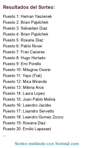 Lista de participantes: Pablo Solsona, Pablo Solsona, Emilse Lencina, Candelaria Gonzalez, Roxana Diaz, Nicolas Benedetto, Micaela Lopez, Roxana Diaz, Roxana Diaz, Nicolas Benedetto, Lisandro Servetto, Roxana Diaz, Facundo Dominguez, Georgina Velazco, Roxana Diaz, Milagros Osorio, Pedro Manrique, Torres Alejandro, Hildo (Fiat), Navas Cesar, Fernando Magallanes, Sebastian Jacobo, Valentina Bonaventura, Jorge Cittadini, Hernan Yaszenek, Túcumano (Fiat), Jesi Leyra, Andrés Paez, Roxana Diaz, Luis cia (Lear), Nestor Callu, Andres Allende, Luis Suarez, Juan Lencina, Tamara Tiseyra, Enrique Santoni, Juan Lencina, Juan Lencina, Andres Montiel, Juan Lencina, Juan Lencina, Juan Lencina, Gato Julio (Fiat), Javier (Fiat), Claudio Ahumada, Yayo (Fiat), Hugo Hurtado, Juan Pablo Molina, Octavio Marcial, Marcos Fariña, Natalia Conci, Paola Hemgren, Sandra Rigotti, Alejandra Garrido, Martin Gudiño, Jorge Cittadini, Pau Chacon, Ana Blanco, Claudia Cortez, Cecilia Arce, Francisco Flores Zega, Luis Tust, Gabriela Martin, Georgina Citadini, Gabriela Borioli, Paola Hemgren, Cristina Suarez, Luis Oxandaburu, Roxana Romero, Natanael Diaz, Nidia Carmen Diaz, Sebastian Diaz, Joel Arias, Meli Cepic, Cuervo Argentinos Jrs, Fernanda Escudero, Joaquin de La Colina Ramirez, Claudio Miranda, Fernanda Escudero, Guillermo Buffa, Guillermo Buffa, Emilio Lapasset, Fernando Laredo, Ricardo Gargiolio, Claudio Miranda, Fernando Laredo, Fabian Flores, Facundo Dominguez, Matias Lopez, Matias Lopez, Pau Chacon, Matias Lopez, Pedro Garbi, Pedro Garbi, Luis Soul, Diego Prystupzuk, Monica Guardia (Anto Abbá), Marcos Re, Diego Prystupzuk, Mica Miranda, Matias Lopez, Paula Quilici, Federico Diner (Banfield), Pablo Vera, Agustin Conforte, Rodrigo Lujan, Diego Prystupzuk, Laura Avila, Rodrigo Lujan, Pablo Vera, Florencia Garello, Laura Lopez, Milagros Osorio, Brian Pajolchek, Brian Pajolchek, David Pisano, Lucas Castro, Iliana Gonzalez, Yorch, Fran Caceres, Rodrigo Lujan, Gastón Lippi, Federico Diner (Banfield), Rodrigo Lencina, Agustin Conforte, Miqueas Rivero, Ema Martinez, Santiago Hernández, Leandro Jacobo, Brian Pajolchek, Santiago Altamirano, Roman Valderenas, Roxana Diaz, Gastón Zegarra, Matias Lopez, Consu Coronel, Lucas Castro, Ricardo Gargiolio, Ricardo Gargiolio, Ricardo Gargiolio, Ricardo Gargiolio, Ricardo Gargiolio, Pablo Escudero, Juan Lopez, Peralta Jadel, Martin Alonzo, Emilio Lapasset, Florencia Sosa, Nicolas Quinteros, Nicolas Quinteros, Igna Santillan, Camila Tejeda, Igna Santillan, Yanina Lippi, Maria Florencia Orona, Emilio Lapasset, Florencia Sosa, Karina Muñoz, Rodrigo Lujan, Florencia Sosa, Luis Salas, Ernesto Lippi, Leandro Jacobo, Alejandra Gutierrez, Marta Gastañaga, Jorgelina Paez, Georgina Cuello, Sol Lopez, Brian Pajolchek, Rocio Hidalgo, Gastón Boscarino, Leandro Gomez Zocco, Juan Lencina, Leandro Jacobo, Carolina Spalletti, Carolina Spalletti, Viviana Dominguez, Natalia Ledesma, Chiara Spalleti, Florencia Garello, Emi Porello, Aylen Braida, Lucas Videla, Gabi (Lippi), Javier Chimbo, Diego Martin Bustos, Emilio Lapasset, Santiago Wass, Bibiana Bogarin, Michael David Bodart, Emilse Lencina, Luis Salas, Florencia Sosa, Adrian Ladron de Guevara, Luis Tejeda, Leandro Jacobo, Fabio Nausneris, Diego Prystupczuk, Leandro Jacobo, Diego Prystupczuk, Karim, Octavio Marcial, Octavio Marcial, Leandro Ramallo, Octavio Marcial, Marcela Campana, Juli (Jona), Paula Ines de la Fuente, Emilio Lapasset, Luis Tejeda, Paula Ines de la Fuente, Leandro Gomez Zocco, Gastón Boscarino, Tadeo Juncos, Camila Tejeda, Lautaro Londero, Marcela Campana, Fatima Boccetti, Ale Boccardo, Rodrigo Lujan, Fernanda Sosa, Anto Abbá, Roman Valderenas, Emi Santini, Javier Chimbo, Mauri Comba, Rodri Martin, Pablo Rovai, Pablo Rovai, Pablo Rovai, Pablo Rovai, Pablo Rovai, Pablo Rovai, Pablo Rovai, Pablo Rovai, Mauri Comba, Florencia Salguero, Agustin Curto, Agustin Curto, Meli Cepic, Emilio Lapasset, Facundo Ignacio Perez, Marcos Micaelli, Mauri (Facu, Jesi Leyra, Milena Arce, Costanza Cabello, Luis Tejeda, Fabiana Flores, Brian Pajolchek.