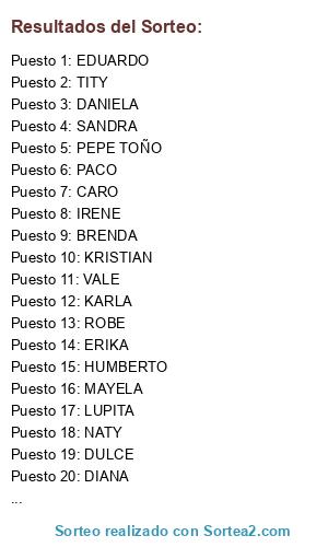 Lista de participantes: NATY(31 participaciones), CARO(27 participaciones), DANIELA(24 participaciones), TITY(24 participaciones), EDUARDO(22 participaciones), IRENE(20 participaciones), SILVIA(20 participaciones), PACO (16 participaciones), SANDRA(16 participaciones), LUPITA(16 participaciones), HUMBERTO(12 participaciones), KARLA(12 participaciones), ERIKA(11 participaciones), ROBE(9 participaciones), BRENDA(9 participaciones), PEPE TOÑO(9 participaciones), MAYRA(8 participaciones), DULCE(8 participaciones), SUSANA(8 participaciones), VALE(7 participaciones), DIANA(7 participaciones), KRISTIAN(7 participaciones), MAYELA(7 participaciones).