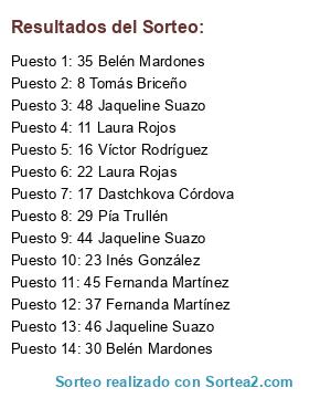 Lista de participantes: 1 Fernanda Martínez, 2 María González, 3 Tomás Briceño, 4 Pame Asencio, 5 Pablo Briceño, 6 Inés González, 7 Sofía Pops, 8 Tomás Briceño, 9 Nancy Jul, 10 María González, 11 Laura Rojos, 12 Lore, 13 Víctor Rodríguez, 14 Inés González, 15 Pablo Briceño, 16 Víctor Rodríguez, 17 Dastchkova Córdova, 18 Nancy Jul, 19 Rocío Collao, 20 Dastchkova Córdova, 21 Rocío Collao, 22 Laura Rojas, 23 Inés González, 24 Joaquín Maulino, 25 Pablo Briceño, 26 Nicolás Briceño, 27 Belén Mardones, 28 Belén Mardones, 29 Pía Trullén, 30 Belén Mardones, 31 Belén Mardones, 32 Belén Mardones, 33 Belén Mardones, 34 Belén Mardones, 35 Belén Mardones, 36 Belén Mardones, 37 Fernanda Martínez, 38 Belén Mardones, 39 María Ignacia, 40 Nicolás Briceño, 41 Jaqueline Suazo, 42 Joaquín Maulino, 43 Jaqueline Suazo, 44 Jaqueline Suazo, 45 Fernanda Martínez, 46 Jaqueline Suazo, 47 María Ignacia, 48 Jaqueline Suazo, 49 Jaqueline Suazo, 50 María José Bastías, 51 Daniel Hernández, 52 Daniel Hernández, 53 Daniel Hernández, 54 Daniel Hernández, 55 Daniel Hernández.