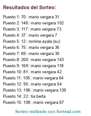 Lista de participantes: 1 susan silva 1, 2 camila castillo, 3 carola yañez, 4 cecilia espinosa, 5 jenny nahuelcheo, 6 katy riffo, 7 lorena urrea 1, 8 maricel silva, 9 paola negrone 1, 10 paula vasquez 1, 11 sheilla muñoz 1, 12 romina ayala (su), 13 ignacia mejias, 14 pablo mejias, 15 paola negrone 2, 16 romina ayala 2 (su), 17 alexis mu{oz, 18 agustina ossandon, 19 andres alexis, 20 romina ayala (su), 21 polito munoz, 22 tia berta, 23 sheilla munoz 2, 24 vicente luna camila, 25 paula vasquez 2, 26 susan silva 2, 27 pia caceres, 28 susan silva 3, 29 insta #todospormite (su 4), 30 insta #todospormaite (su 5), 31 mario vergara 1, 32 mario vergara 2, 33 mario vergara 3, 34 mario vergara 4, 35 mario vergara 5, 36 mario vergara 6, 37 mario vergara 7, 38 mario vergara 8, 39 mario vergara 9, 40 mario vergara 10, 41 mario vergara 11, 42 mario vergara 12, 43 mario vergara 13, 44 mario vergara 14, 45 mario vergara 15, 46 mario vergara 16, 47 mario vergara 17, 48 mario vergara 18, 49 mario vergara 19, 50 mario vergara 20, 51 karla rosales (susan me pago), 52 vale mancilla, 53 claudia palma 1, 54 claudia palma 2, 55 insta #todospormaite (su 6), 56 insta #todospormaite (su 7), 57 insta #todospormaite (su 8), 58 carlos bohhemio nuñez (su), 59 familia zenteno correa, 60 mario vergara 21, 61 mario vergara 22, 62 mario vergara 23, 63 mario vergara 24, 64 mario vergara 25, 65 mario vergara 26, 66 mario vergara 27, 67 mario vergara 28, 68 mario vergara 29, 69 mario vergara 30, 70 mario vergara 31, 71 mario vergara 32, 72 mario vergara 33, 73 mario vergara 34, 74 mario vergara 35, 75 mario vergara 36, 76 mario vergara 37, 77 mario vergara 38, 78 mario vergara 39, 79 mario vergara 40, 80 mario vergara 41, 81 mario vergara 42, 82 mario vergara 43, 83 mario vergara 44, 84 mario vergara 45, 85 mario vergara 46, 86 mario vergara 47, 87 mario vergara 48, 88 mario vergara 49, 89 mario vergara 50** (antes 36), 90 susan silva 4, 91 familia rioseco bahamondes, 92 mario vergara 51, 93 mario vergara 52, 94 mario vergara 53, 95 mario vergara 54, 96 mario vergara 55, 97 mario vergara 56, 98 mario vergara 57, 99 mario vergara 58, 100 mario vergara 59, 101 mario vergara 60, 102 mario vergara 61, 103 mario vergara 62, 104 mario vergara 63, 105 mario vergara 64, 106 mario vergara 65, 107 mario vergara 66, 108 mario vergara 67, 109 mario vergara 68, 110 mario vergara 69, 111 mario vergara 70, 112 carla rojas y martha mendez(lore), 113 Sheilla Muñoz 3, 114 hermana lore urrea, 115 mario vergara 71, 116 mario vergara 72, 117 mario vergara 73, 118 mario vergara 74, 119 mario vergara 75, 120 mario vergara 76, 121 mario vergara 77, 122 mario vergara 78, 123 mario vergara 79, 124 mario vergara 80, 125 mario vergara 81, 126 mario vergara 82, 127 mario vergara 83, 128 mario vergara 84, 129 mario vergara 85, 130 mario vergara 86, 131 mario vergara 87, 132 mario vergara 88, 133 mario vergara 89, 134 mario vergara 90, 135 mario vergara 91, 136 mario vergara 92, 137 mario vergara 93, 138 mario vergara 94, 139 mario vergara 95, 140 mario vergara 96, 141 mario vergara 97, 142 mario vergara 98, 143 mario vergara 99, 144 mario vergara 100, 145 mario vergara 101, 146 mario vergara 102, 147 mario vergara 103, 148 mario vergara 104, 149 mario vergara 105, 150 mario vergara 106, 151 constanza chrame 2 (su), 152 constanza chrame 3 (su), 153 jacqueline zamorano (su), 154 jacqueline zamorano (su), 155 insta #todospormaite (su 9), 156 insta #todospormaite (su 10), 157 insta #todospormaite (su 11), 158 mario vergara 107, 159 mario vergara 108, 160 mario vergara 109, 161 mario vergara 110, 162 mario vergara 111, 163 mario vergara 112, 164 mario vergara 113, 165 mario vergara 114, 166 mario vergara 115, 167 mario vergara 116, 168 mario vergara 117, 169 mario vergara 118, 170 mario vergara 119, 171 mario vergara 120, 172 mario vergara 121, 173 mario vergara 122, 174 mario vergara 123, 175 mario vergara 124, 176 mario vergara 125, 177 mario vergara 126, 178 mario vergara 127, 179 mario vergara 128, 180 mario vergara 129, 181 mario vergara 130, 182 mario vergara 131, 183 mario vergara 132, 184 mario vergara 133, 185 mario vergara 134, 186 mario vergara 135, 187 mario vergara 136, 188 adriana saavedra volvaran insta (su), 189 jorge salgado insta (su), 190 insta #todospormaite (su 12), 191 Lorena urrea 2, 192 insta #todospormaite (su 13), 193 insta #todospormaite (su 14), 194 mario vergara 137, 195 mario vergara 138, 196 mario vergara 139, 197 mario vergara 140, 198 mario vergara 141, 199 mario vergara 142, 200 mario vergara 143, 201 mario vergara 144, 202 mario vergara 145, 203 mario vergara 146, 204 karla rosales (susan me pago), 205 carlos bohhemio nuñez (su).