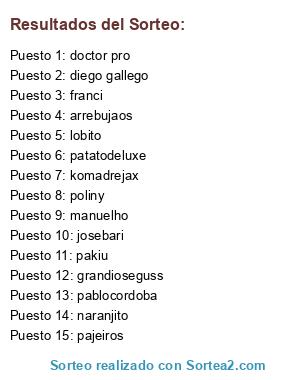 Lista de participantes: pablocordoba, arrebujaos, josebari, diego gallego, patatodeluxe, doctor pro, franci, lobito, pakiu, pajeiros, grandioseguss, komadrejax, naranjito, manuelho, poliny.