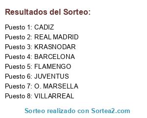 Lista de participantes: CADIZ, KRASNODAR, VILLARREAL, REAL MADRID, BARCELONA, JUVENTUS, FLAMENGO, O. MARSELLA.