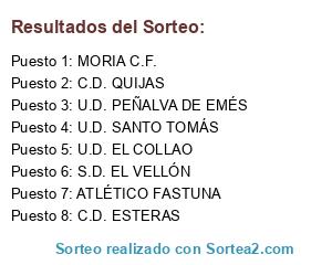 Lista de participantes: S.D. EL VELLÓN, C.D. QUIJAS, U.D. SANTO TOMÁS, U.D. EL COLLAO, ATLÉTICO FASTUNA, C.D. ESTERAS, MORIA C.F., U.D. PEÑALVA DE EMÉS.