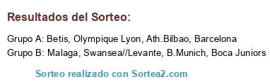 Lista de participantes: Boca Juniors, Olympique Lyon, Betis, Swansea//Levante, Barcelona, B.Munich, Malaga, Ath.Bilbao.