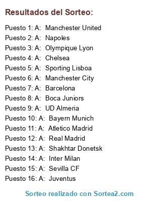 Lista de participantes: A: Manchester City, A: Chelsea, A: Atletico Madrid, A: Manchester United, A: Inter Milan, A: Boca Juniors, A: Juventus, A: Bayern Munich, A: Shakhtar Donetsk, A: Sevilla CF, A: Sporting Lisboa, A: Real Madrid, A: UD Almeria, A: Napoles, A: Olympique Lyon, A: Barcelona.