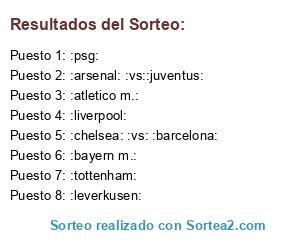Lista de participantes: :arsenal: :vs::juventus:, :bayern m.:, :chelsea: :vs: :barcelona:, :psg:, :liverpool:, :tottenham:, :leverkusen:, :atletico m.:.