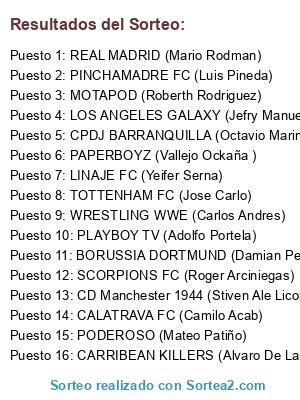 Lista de participantes: CPDJ BARRANQUILLA (Octavio Marin), PODEROSO (Mateo Patiño), LINAJE FC (Yeifer Serna), REAL MADRID (Mario Rodman), PINCHAMADRE FC (Luis Pineda), CARRIBEAN KILLERS (Alvaro De La Rosa), PLAYBOY TV (Adolfo Portela), TOTTENHAM FC (Jose Carlo), LOS ANGELES GALAXY (Jefry Manuel), MOTAPOD (Roberth Rodriguez), CALATRAVA FC (Camilo Acab), BORUSSIA DORTMUND (Damian Perea), PAPERBOYZ (Vallejo Ockaña ), CD Manchester 1944 (Stiven Ale Licona), WRESTLING WWE (Carlos Andres), SCORPIONS FC (Roger Arciniegas).