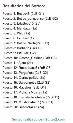 Lista de participantes: Mendaza (1a), Nane Team (2aB G3), TK Betis (1a), 19Dani07 (2a), Juancrinus (2aB G1), Ajora (2a), OprincipeEdu (2a), Betico_conquense (2aB G2), Senver (2aB G1), Manolete (1a), Betissss (2a), ElCapa (2aB G2), EduBetis10 (2a), Teskiya (2aB G3), Barksdale (2a), German Bubu (1a), Wild (1a), Betico45 (2aB G1), Jlas (2a), Robertbacu5 (2aB G3), Dani Almenara (2aB G2), Vitillo (2a), Blackgon (2aB G1), Tryphon Ivanov (2aB G1), Racebes (2aB G1), AlberV17 (2a), Luison58 (2aB G3), Er Dehfase (2a), Frankfurter-Betico (2aB G1), Fran Castellano (2a), MoiLeiva (2a), Nacho Mtnez (1a), BeticoNazari (2a), Mushobetis07 (2aB G1), Garp (2aB G1), Lembo7 (1a), Betico_Norte(2aB G1), Tempo23 (1a), JmJota (2aB G3), Gran-Uja (1a), Pergañeta (2aB G2), Fernanbetico (1a), LaPreviaFantasy (2aB G2), Pichichi Molina (1a), Piti (2aB G2), Alvaro FC (2aB G3), Botas_blancas1097 (1a), Barbarinetis (2aB G2), Muñoz.RBB (2aB G2), Josempobetico (2aB G2), Cherubino (2aB G3), Tribuna (2aB G3), Barbarin (2aB G3), Gaston_Casillas (2aB G3).