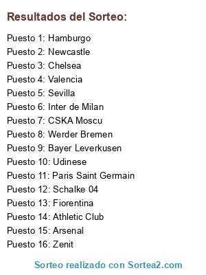 Lista de participantes: Inter de Milan, Chelsea, Athletic Club, Paris Saint Germain, CSKA Moscu, Udinese, Fiorentina, Schalke 04, Newcastle, Zenit, Werder Bremen, Sevilla, Hamburgo, Valencia, Bayer Leverkusen, Arsenal.