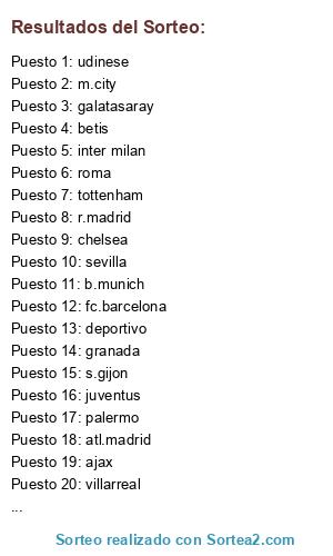 Lista de participantes: fc.barcelona, tottenham, r.madrid, newcastle, palermo, inter milan, chelsea, lazio, betis, ac.milan, m.city, s.gijon, udinese, basilea, villarreal, juventus, b.munich, rayo vallecano, galatasaray, m.united, mallorca, ajax, roma, malaga, granada, fenerbache, ath.bilbao, sevilla, atl.madrid, liverpool, deportivo, napoles.