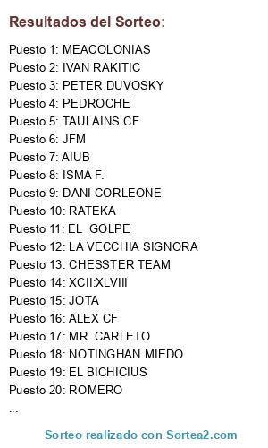 Lista de participantes: PETER DUVOSKY, RAFA MENDES, CHUMI, DULCE CONDENA, ARQUILLOS, RAULIOFORD, MR. CARLETO, WINNING ELEVEN, FERNANDO CASTELLOTE GANDIA, MANUEL D, GELETE, CHESSTER TEAM, TAULAINS CF, GOATLETI, LA VECCHIA SIGNORA, LUKA TRUNKS, IVAN RAKITIC, REN HONJO, DAMI, XCII:XLVIII, CHUPE, VALLADARES, OLIVER ATOM, SAMU, NOTINGHAN MIEDO, JFM, DANIMADOR, PIRULO72, AVEVIR, PEDROCHE, ANEROL, STRESSHUNTER, SAUL GOODMAN, ISMA F., SUPERCLOWN, ARPALO, EL GOLPE, ISLEÑO, ALEX CF, S. PANZA, KARRACEDO, MIGUELON, DEIVID, GRAN CAPITAN, NEGAN CF, DANI CORLEONE, JOSE MANUEL FLOR LOPEZ, JOTA, AIUB, SOBARRIBA, MAGIC ORELLUT, MEACOLONIAS, MANKENEGAN, JAVITOVALENCIANISTA, RATEKA, OIER, MORTA, PERICO17, AL-, BEGINES, CHARLY RM, EL BICHICIUS, ALBERTO MUMA, ROMERO.