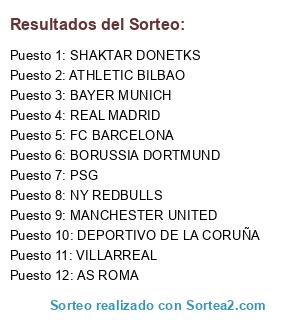 Lista de participantes: PSG, NY REDBULLS, SHAKTAR DONETKS, AS ROMA, BORUSSIA DORTMUND, FC BARCELONA, VILLARREAL, DEPORTIVO DE LA CORUÑA, BAYER MUNICH, REAL MADRID, ATHLETIC BILBAO, MANCHESTER UNITED.