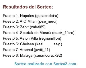 Lista de participantes: Spartak de Moscú (crack_fifero), A.C.Milan (jose_medi), Napoles (gusacedeira), Chelsea (kasi_____sey ), Malaga (canariocrack92), Zenit (xabel85), Aston Villa (regnumllion), Arsenal (javiii_11).