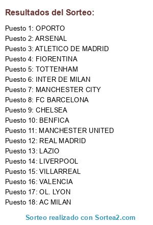 Lista de participantes: AC MILAN, ARSENAL, ATLETICO DE MADRID, CHELSEA, FC BARCELONA, FIORENTINA, INTER DE MILAN, LIVERPOOL, MANCHESTER CITY, MANCHESTER UNITED, REAL MADRID, LAZIO, TOTTENHAM, VALENCIA, VILLARREAL, BENFICA, OPORTO, OL. LYON.