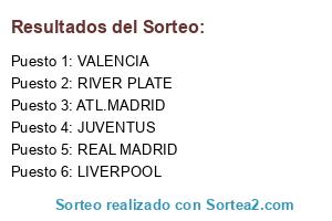 Lista de participantes: REAL MADRID, JUVENTUS, ATL.MADRID, LIVERPOOL, RIVER PLATE, VALENCIA.