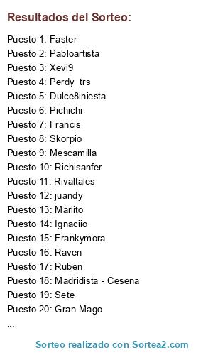 Lista de participantes: Blackdeevil, Juanca_11_pro, Lumpa7, Perdy_trs, Faster, Francis, Mescamilla, Fabio_85, Ruben, Dulce8iniesta, Gutista, Stoned, Pabloartista, Iru, Ignaciio, Litoo, Sete, Xevi9, Skorpio, Lolazo, Cortexx, Alicate, Pichichi, Rafana, Peperecre - Real Betis, Luigui - Oporto, Madridista - Cesena, Rivaltales, Jas, Hybrid, Assalito, MR7, Fortopeta, Cata, Richisanfer, Gores, Rubale, Ridisc, Raven, Flakojmays, Frankymora, Gran Mago, Marlito, Fer, dani_cdsf, jossepolo, juandy, osvaldito, toor, ferrari.