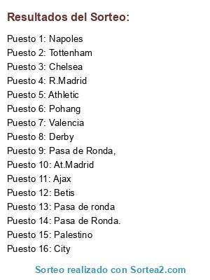 Lista de participantes: Napoles, Palestino, Pasa de ronda, Derby, Pasa de Ronda,, Athletic, Chelsea, Pasa de Ronda., Ajax, Betis, City, At.Madrid, Tottenham, Pohang, Valencia, R.Madrid.