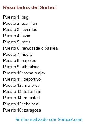 Lista de participantes: ac.milan, zaragoza, juventus, chelsea, ath.bilbao, tottenham, mallorca, betis, lazio, m.city, m.united, napoles, deportivo, psg, newcastle o basilea, roma o ajax.
