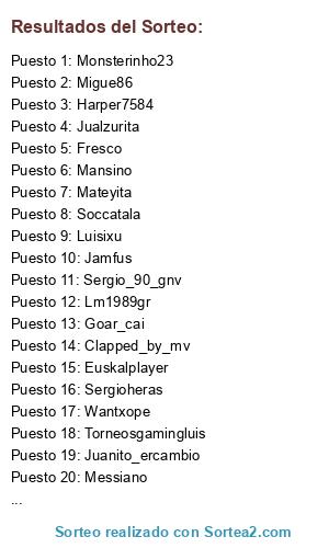 Lista de participantes: AlePGL, Xaviloko, Negri, Emilich, Lionheart, Wantxope, Cadista, Jiliyo, Fista, Daniorlo, Ronierm, Mansino, Jamfus, Sergio_90_gnv, Zeulito, Camandula, Messiano, Euskalplayer, Goar_cai, Jualzurita, Peperecre, Jesure, Luisixu, AlexRamos, Fresco, Malasombra, Kefergas, Soccatala, Jordi25, Ayo, Sergioheras, Lm1989gr, Caubo12, Mateyita, Kharimpool, Juanito_ercambio, PoloVCF, Danitorix, Kaiser-sh7, Pauuu24, Durbe, Migue86, Nyzanes, Monsterinho23, Franchu1234, Torneosgamingluis, Harper7584, Clapped_by_mv.