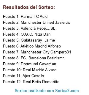 Lista de participantes: FC. Barcelona Brainismr., Valencia Pepe....SL, Manchester United Javierux, Manchester City Campero31, Parma FC Acid, Real Betis Romeritto, Real Madrid Alvaro, O.G.C. Niza Dani, Atlético Madrid Alfonso, Dortmund Caveman, Ajax Casells, Galatasaray Jaime.