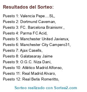 Lista de participantes: FC. Barcelona Brainismr.,, Valencia Pepe....SL,, Manchester United Javierux,, Manchester City Campero31,, Parma FC Acid,, Real Betis Romeritto,, Real Madrid Alvaro,, O.G.C. Niza Dani,, Atlético Madrid Alfonso,, Dortmund Caveman,, Ajax Casells,, Galatasaray Jaime.