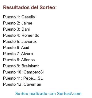 Lista de participantes: Acid, Campero31, Alvaro, Brainismr, Casells, Caveman, Pepe....SL, Alfonso, Romeritto, Dani, Jaime, Javierux.