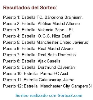 Lista de participantes: Estrella FC. Barcelona Brainismr., Estrella Valencia Pepe....SL, Estrella Manchester United Javierux, Estrella Manchester City Campero31, Estrella Parma FC Acid, Estrella Real Betis Romeritto, Estrella Real Madrid Alvaro, Estrella O.G.C. Niza Dani, Estrella Atlético Madrid Alfonso, Estrella Dortmund Caveman, Estrella Ajax Casells, Estrella Galatasaray Jaime.