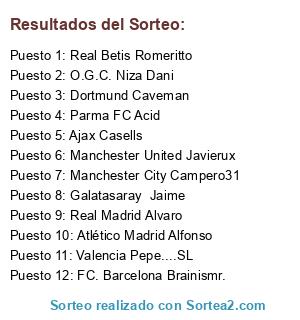 Lista de participantes: FC. Barcelona Brainismr., Valencia Pepe....SL, Manchester United Javierux, Manchester City Campero31, Parma FC Acid, Real Betis Romeritto, Real Madrid Alvaro, O.G.C. Niza Dani, Atlético Madrid Alfonso, Dortmund Caveman, Ajax Casells, Galatasaray Jaime.