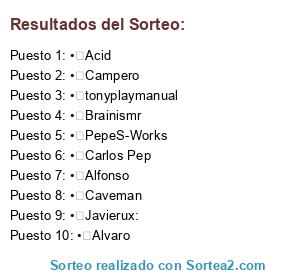 Lista de participantes: • Alfonso, • Alvaro, • Carlos Pep, • Acid, • Caveman, • tonyplaymanual, • Campero, • Brainismr, • Javierux:, • PepeS-Works.