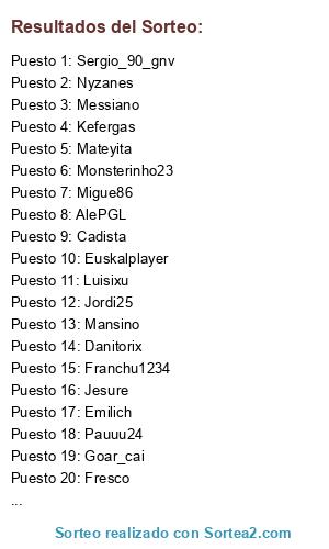Lista de participantes: AlePGL, Xaviloko, Negri, Emilich, Lionheart, Wantxope, Cadista, Jiliyo, Fista, Daniorlo, Ronierm, Mansino, Jamfus, Sergio_90_gnv, Zeulito, Camandula, Messiano, Euskalplayer, Goar_cai, Jualzurita, Peperecre, Jesure, Luisixu, AlexRamos, Fresco, Malasombra, Kefergas, Soccatala, Jordi25, Ayo, Sergioheras, Lm1989gr, Caubo12, Mateyita, Kharimpool, Juanito_ercambio, PoloVCF, Danitorix, Kaiser-sh7, Pauuu24, Durbe, Migue86, Nyzanes, Monsterinho23, Franchu1234, Torneosgamingluis, Harper7584, Clapped_by_mv.