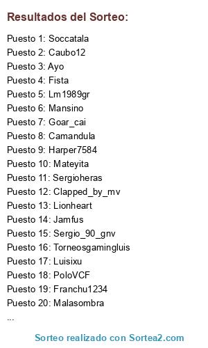 Lista de participantes: AlePGL, Xaviloko, Negri, Emilich, Lionheart, Wantxope, Cadista, Jiliyo, Fista, Daniorlo, Ronierm, Mansino, Jamfus, Sergio_90_gnv, Zeulito, Camandula, Messiano, Euskalplayer, Goar_cai, Jualzurita, Peperecre, Jesure, Luisixu, AlexRamos, Fresco, Malasombra, Kefergas, Soccatala, Jordi25, Ayo, Sergioheras, Lm1989gr, Caubo12, Mateyita, Kharimpool, Juanito_ercambio, PoloVCF, Danitorix, Kaiser-sh7, Pauuu24, Durbe, Migue86, Nyzanes, Monsterinho23, Franchu1234, Torneosgamingluis, Harper7584, Clapped_by_mv.