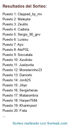 Lista de participantes: AlePGL, Xaviloko, Negri, Emilich, Lionheart, Wantxope, Cadista, Jiliyo, Fista, Daniorlo, Ronierm, Mansino, Jamfus, Sergio_90_gnv, Zeulito, Camandula, Messiano, Euskalplayer, Goar_cai, Jualzurita, Peperecre, Jesure, Luisixu, AlexRamos, Fresco, Malasombra, Kefergas, Soccatala, Jordi25, Ayo, Sergioheras, Lm1989gr, Caubo12, Mateyita, Kharimpool, Juanito_ercambio, PoloVCF, Danitorix, Kaiser-sh7, Pauuu24, Durbe, Migue86, Nyzanes, Monsterinho23, Franchu1234, Torneosgamingluis, Harper7584, Clapped_by_mv.