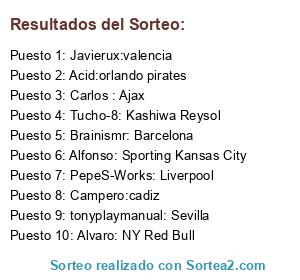 Lista de participantes: Campero:cadiz, Javierux:valencia, Acid:orlando pirates, Alvaro: NY Red Bull, Brainismr: Barcelona, tonyplaymanual: Sevilla, Alfonso: Sporting Kansas City, Carlos : Ajax, PepeS-Works: Liverpool, Tucho-8: Kashiwa Reysol.