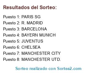 Lista de participantes: BARCELONA, R. MADRID, BAYERN MUNICH, JUVENTUS, MANCHESTER UTD., MANCHESTER CITY, PARIS SG, CHELSEA.