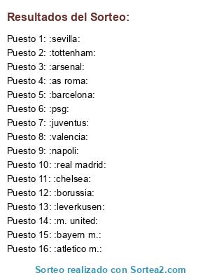 Lista de participantes: :barcelona:, :bayern m.:, :juventus:, :psg:, :real madrid:, :as roma:, :tottenham:, :arsenal:, :borussia:, :chelsea:, :atletico m.:, :m. united:, :napoli:, :sevilla:, :valencia:, :leverkusen:.