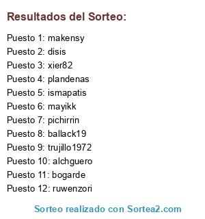 Lista de participantes: xier82, pichirrin, disis, alchguero, ballack19, plandenas, trujillo1972, bogarde, ruwenzori, mayikk, ismapatis, makensy.