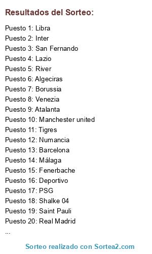 Lista de participantes: PSG, Athletic Club , Flamengo, Sevilla, Tigres, Numancia, San Fernando, Venezia, Inter, Shalke 04, Real Madrid, Real Murcia, Saint Pauli, Lyon, Córdoba, Atalanta, Algeciras, Pumas, Ac Milán, Barcelona, Libra, Deportivo, Manchester united, Borussia, Corinthians, Málaga, Ajax vs Celta, Lazio, River, Real Sociedad Vs Atlético, Fenerbache, Red Bull.