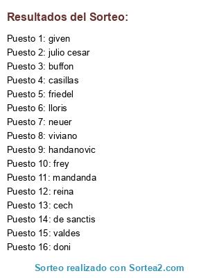 Lista de participantes: buffon, casillas, julio cesar, neuer, valdes, cech, frey, friedel, lloris, handanovic, reina, given, viviano, de sanctis, mandanda, doni.