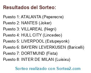 Lista de participantes: DEPORTIVO DE LA CORUÑA (Fenoy), BAYERN LEVERKUSEN (Baricelli), VALENCIA (AlePGL), VILLAREAL (Negri), NANTES (Joker), DORTMUND (Fista), RANGERS (Wan), INTER DE MILAN (Luisixu), HULL CITY (Lincedeo), LIVERPOOL (Estupeyonk), ATALANTA (Peperecre), BARCELONA (Miguee).