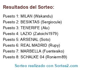 Lista de participantes: ARSENAL (Soto), BESIKTAS (Sergiocule), CHELSEA (Aktgano), SCHALKE 04 (Ronierm89), REAL MADRID (Rupy), MARBELLA (Fuentesiko), LEEDS UNITED (Zeulito), MILAN (Wakandu), PSV (Fransigalda), TENERIFE (Alu), PSG (Parrika), LAZIO (Zatoichi1979).