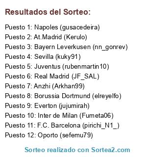 Lista de participantes: Anzhi (Arkhan99), Inter de Milan (Fumeta06), Oporto (sefemu79), Real Madrid (JF_SAL), Sevilla (kuky91), At.Madrid (Kerulo), Bayern Leverkusen (nn_gonrev), Borussia Dortmund (elreyelfo), Everton (jujumirah), Juventus (rubenmartin10), F.C. Barcelona (pirichi_N1_), Napoles (gusacedeira).