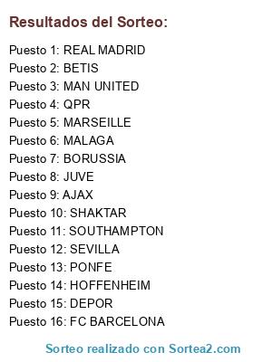 Lista de participantes: AJAX, BORUSSIA, FC BARCELONA, JUVE, MALAGA, MAN UNITED, MARSEILLE, QPR, DEPOR, PONFE, SOUTHAMPTON, HOFFENHEIM, BETIS, SHAKTAR, SEVILLA, REAL MADRID.