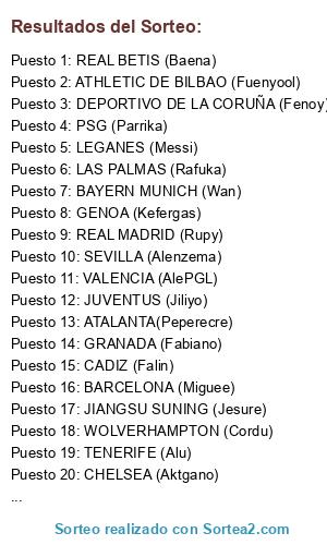 Lista de participantes: BARCELONA (Miguee), VALENCIA (AlePGL), TOTTENHAM (Fista), LIVERPOOL (Estupeyonk), INTER DE MILAN (Luisixu), VILLAREAL (Negri), BAYERN MUNICH (Wan), MILAN (Lincedeo), ATALANTA(Peperecre), LEVANTE (Manuwatagata), LAS PALMAS (Rafuka), DEPORTIVO DE LA CORUÑA (Fenoy), REAL BETIS (Baena), SEVILLA (Alenzema), REDBULL LEIPZIG (Toni3_13), SAINT- ETTIENE (Wakandu), NAPOLES (Jesure), CADIZ (Falin), ATHLETIC DE BILBAO (Fuenyool), CORDOBA (Juanmi), LEICESTER (Troyano), GRANADA (Fabiano), ATLETICO DE MADRID (Daniorlo), SAMPDORIA (Ramonelectrico), JIANGSU SUNIN(Kamikaze), SCHALKE 04 (Ronierm89), BOCA JUNIORS (Kefergas), BAYERN LEVERKUSEN (Baricelli), MANCHESTER UNITED (Pescaito), NEWCASTLE (Jordi), UNION ESPAÑOLA (Leopardo), MANCHESTER CITY (Majeitor), PSV (Penha), REAL MADRID (Rupy), JUVENTUS (Spawntfe), TENERIFE (Alu), CELTIC (Toni89), CHELSEA (Aktgano), CELTA (Reidaria), OPORTO (Manuel lara), BESIKTAS (Sergiocule), PSG (Parrika), ROMA (Jiliyo), MALAGA (Fuentesiko), LEGANES (Leomessi), OSASUNA (Masky), MONACO (Luiso), LAZIO (Diegomat).