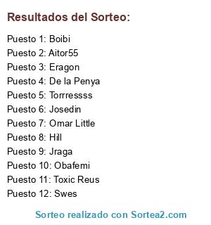 Lista de participantes: Hill, Omar Little, Swes, Torrressss, Aitor55, Boibi, De la Penya, Eragon, Josedin, Jraga, Obafemi, Toxic Reus.