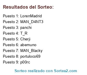 Lista de participantes: MAN_Blacky, p00rc, LorenMadrid, panchi, T_R, Cherji, portuloco69, abemuno, MAN_D4NT3.