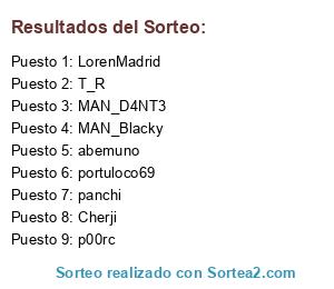 Lista de participantes: abemuno, T_R, MAN_Blacky, LorenMadrid, Cherji, portuloco69, MAN_D4NT3, p00rc, panchi.