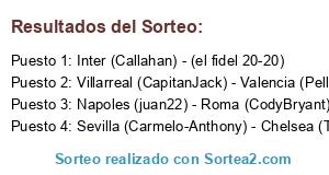 Lista de participantes: Inter (Callahan) - (el fidel 20-20), Arsenal (Fer_zgz) - Atletico Madrid (Kst2), Liverpool (Chuyhouse) - Manchester City (BarraKuda), Milan (Revan23) - Real Madrid (Perchita23, Sevilla (Carmelo-Anthony) - Chelsea (TheKun), Tottenham (BurfoK - Juventus (Kebego), Napoles (juan22) - Roma (CodyBryant), Lyon (iBiCeNCo) - Bayern M. (Jotha-), Villarreal (CapitanJack) - Valencia (Pellizas), F.C Barcelona(Angelito81) - Manchester United (Shean).