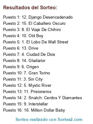 Lista de participantes: 1. El Lobo De Wall Street, 2. Snatch: Cerdos Y Diamantes, 3. Sin City, 4. Ciudad De Dios, 5. Mystic River, 6. Origen, 7. Gran Torino, 8. El Viaje De Chihiro, 9. Interstellar, 10. Old Boy, 11. Prisioneros, 12. Django Desencadenado, 13. Drive, 14. Gladiator, 15. El Caballero Oscuro, 16. Million Dollar Baby.