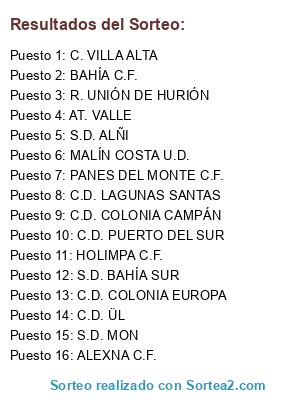 Lista de participantes: HOLIMPA C.F., C.D. COLONIA EUROPA, R. UNIÓN DE HURIÓN, S.D. ALÑI, S.D. BAHÍA SUR, MALÍN COSTA U.D., PANES DEL MONTE C.F., AT. VALLE, ALEXNA C.F., C. VILLA ALTA, S.D. MON, C.D. COLONIA CAMPÁN, C.D. LAGUNAS SANTAS, BAHÍA C.F., C.D. PUERTO DEL SUR, C.D. ÜL.